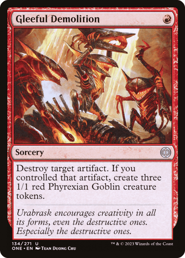 Destroy target artifact. If you controlled that artifact, create three 1/1 red Phyrexian Goblin creature tokens.