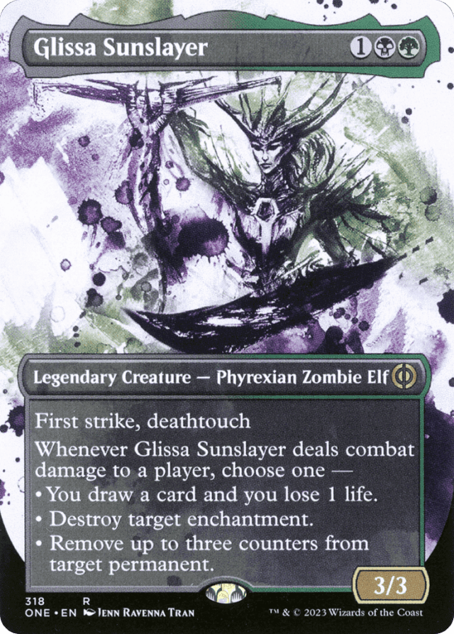First strike, deathtouch Whenever Glissa Sunslayer deals combat damage to a player, choose one — • You draw a card and you lose 1 life. • Destroy target enchantment. • Remove up to three counters from target permanent.
