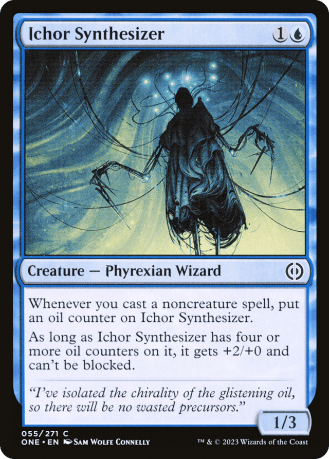 Whenever you cast a noncreature spell, put an oil counter on this creature. As long as this creature has four or more oil counters on it, it gets +2/+0 and can't be blocked.