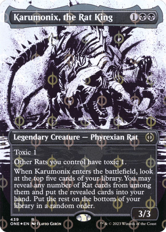 Toxic 1 (Players dealt combat damage by this creature also get a poison counter.) Other Rats you control have toxic 1. When Karumonix enters, look at the top five cards of your library. You may reveal any number of Rat cards from among them and put the revealed cards into your hand. Put the rest on the bottom of your library in a random order.