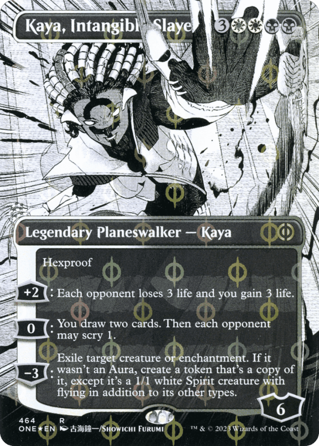 Any enters-the-battlefield abilities of the copied permanent will trigger when the token enters the battlefield. Any "as [this permanent] enters the battlefield" or "[this permanent] enters the battlefield with" abilities of the chosen permanent will also work. — Except for the listed exceptions, the token copies exactly what was printed on the original permanent and nothing else (unless that permanent is copying something else or it is a token; see below). It doesn't copy whether that creature is tapped or untapped, whether it has any counters on it or Auras and Equipment attached to it, and so on. — For the middle loyalty ability, each opponent in turn order chooses whether or not to scry. Those who do (likely all of them) look at the top card of their library at the same time, then they decide in turn order where their card goes. Each opponent will know the choices of previous players in turn order before making their own choices. — If the copied creature has {X} in its mana cost, X is 0. — If the copied creature is a token, the new token that's created copies the original characteristics of that token as stated by the effect that created that token, with the exceptions noted above. — If the copied permanent is copying something else, then the token enters the battlefield as whatever that permanent copied, with the exceptions noted above. — Kaya's last ability checks to see whether the permanent was an Aura when it last existed on the battlefield, not whether it is an Aura card in exile. For example, if an enchantment creature with the bestow ability (an ability that allows a creature card to be cast as an Aura instead) is an Aura and the target of Kaya's last ability, the ability will not create a copy of it.