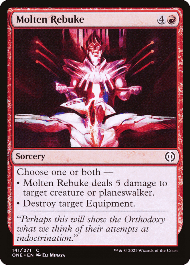 Choose one or both — • Molten Rebuke deals 5 damage to target creature or planeswalker. • Destroy target Equipment.