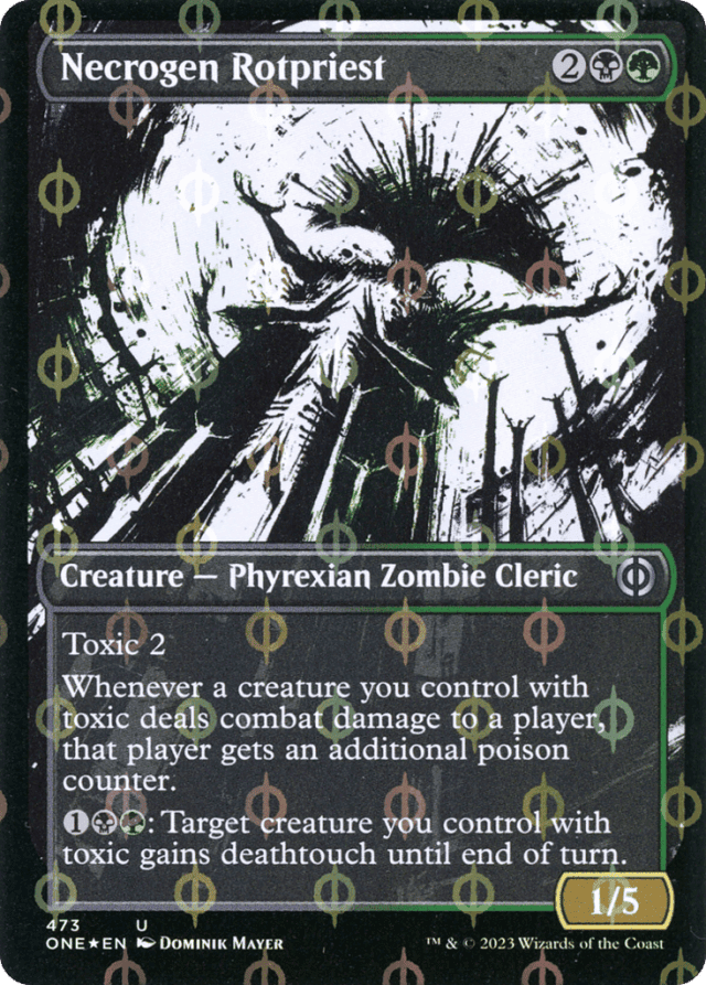 Toxic 2 (Players dealt combat damage by this creature also get two poison counters.) Whenever a creature you control with toxic deals combat damage to a player, that player gets an additional poison counter. {1}{B}{G}: Target creature you control with toxic gains deathtouch until end of turn.