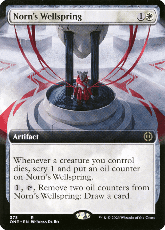 Whenever a creature you control dies, scry 1 and put an oil counter on this artifact. {1}, {T}, Remove two oil counters from this artifact: Draw a card.