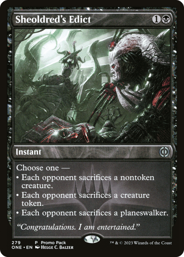Choose one — • Each opponent sacrifices a nontoken creature of their choice. • Each opponent sacrifices a creature token of their choice. • Each opponent sacrifices a planeswalker of their choice.