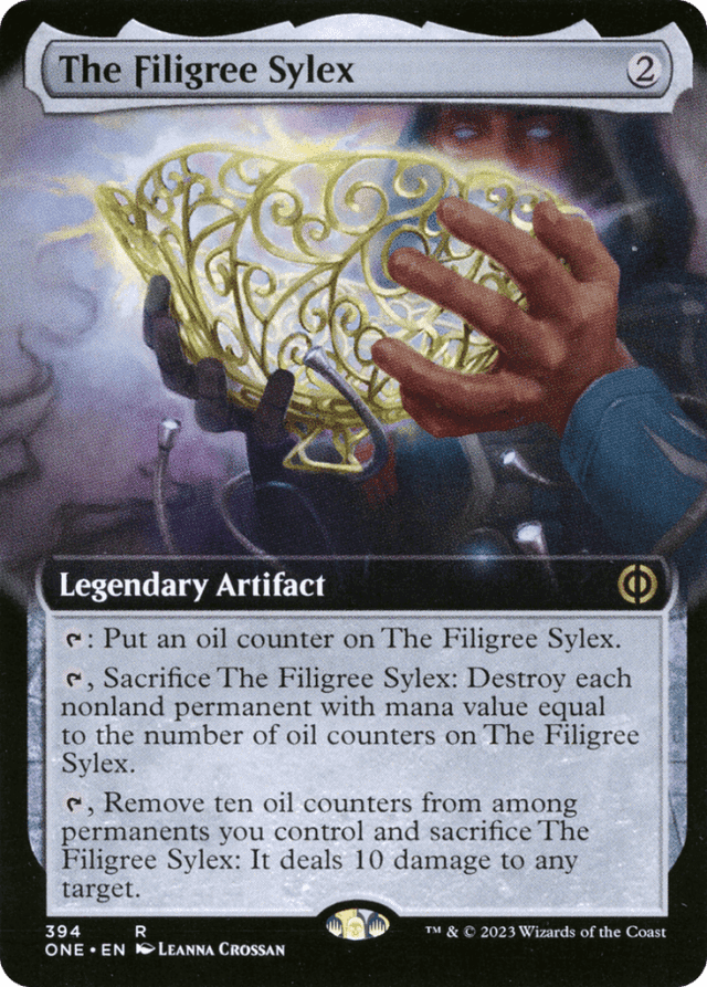 {T}: Put an oil counter on The Filigree Sylex. {T}, Sacrifice The Filigree Sylex: Destroy each nonland permanent with mana value equal to the number of oil counters on The Filigree Sylex. {T}, Remove ten oil counters from among permanents you control and sacrifice The Filigree Sylex: It deals 10 damage to any target.
