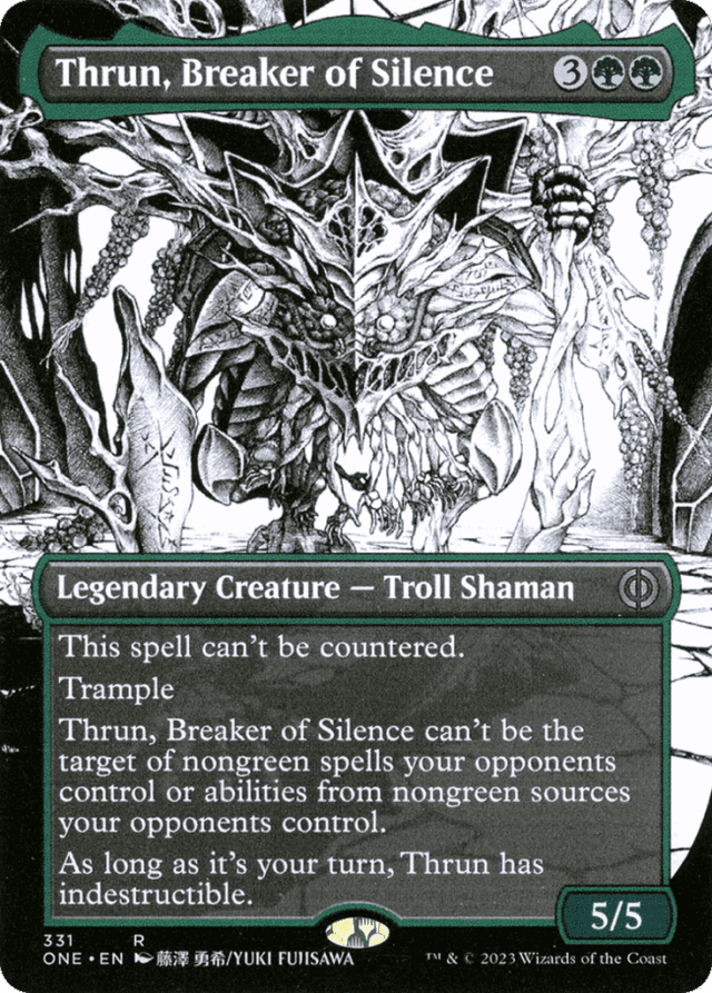 This spell can't be countered. Trample Thrun can't be the target of nongreen spells your opponents control or abilities from nongreen sources your opponents control. During your turn, Thrun has indestructible.
