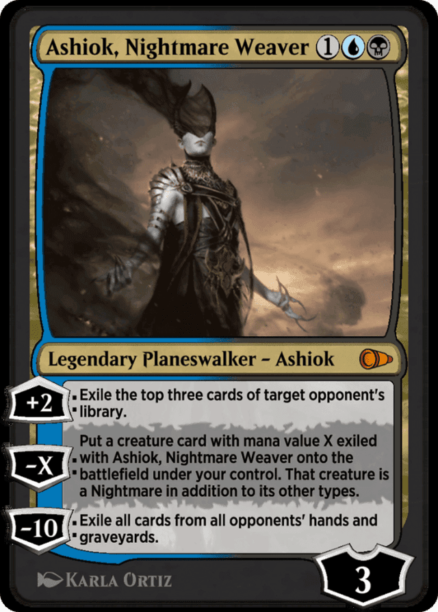 [+2]: Exile the top three cards of target opponent's library. [−X]: Put a creature card with mana value X exiled with Ashiok onto the battlefield under your control. That creature is a Nightmare in addition to its other types. [−10]: Exile all cards from all opponents' hands and graveyards.