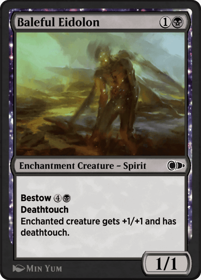 Bestow {4}{B} (If you cast this card for its bestow cost, it's an Aura spell with enchant creature. It becomes a creature again if it's not attached to a creature.) Deathtouch (Any amount of damage this deals to a creature is enough to destroy it.) Enchanted creature gets +1/+1 and has deathtouch.