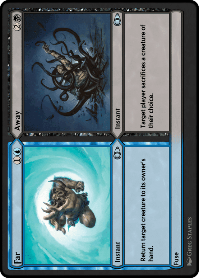 Away targets only a player. It doesn't target any creatures. The target player chooses which creature to sacrifice as the spell resolves. — If a player names a card, the player may name either half of a split card, but not both. A split card has the chosen name if one of its two names matches the chosen name. — If you cast a split card with fuse from your hand without paying its mana cost, you can choose to use its fuse ability and cast both halves without paying their mana costs. — If you're casting a split card with fuse from any zone other than your hand, you can't cast both halves. You'll only be able to cast one half or the other. — On the stack, a split spell that hasn't been fused has only that half's characteristics and mana value. The other half is treated as though it didn't exist. — Some split cards with fuse have two halves that are both multicolored. That card is multicolored no matter which half is cast, or if both halves are cast. It's also multicolored while not on the stack. — Some split cards with fuse have two monocolor halves of different colors. If such a card is cast as a fused split spell, the resulting spell is multicolored. If only one half is cast, the spell is the color of that half. While not on the stack, such a card is multicolored. — To cast a fused split spell, pay both of its mana costs. While the spell is on the stack, its mana value is the total amount of mana in both costs. — When a fused split spell resolves, follow the instructions of the left half first, then the instructions on the right half. — When resolving a fused split spell with multiple targets, treat it as you would any spell with multiple targets. If all targets are illegal when the spell tries to resolve, the spell doesn't resolve and none of its effects happen. If at least one target is still legal at that time, the spell resolves, but an illegal target can't perform any actions or have any actions performed on it. — You can choose the same object as the target of each half of a fused split spell, if appropriate.