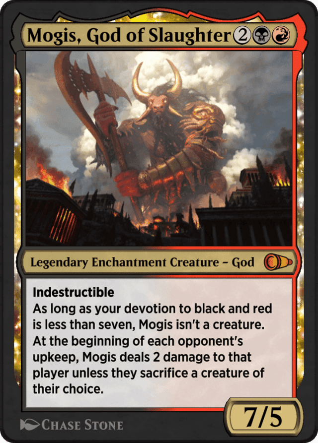 Indestructible As long as your devotion to black and red is less than seven, Mogis isn't a creature. At the beginning of each opponent's upkeep, Mogis deals 2 damage to that player unless they sacrifice a creature of their choice.