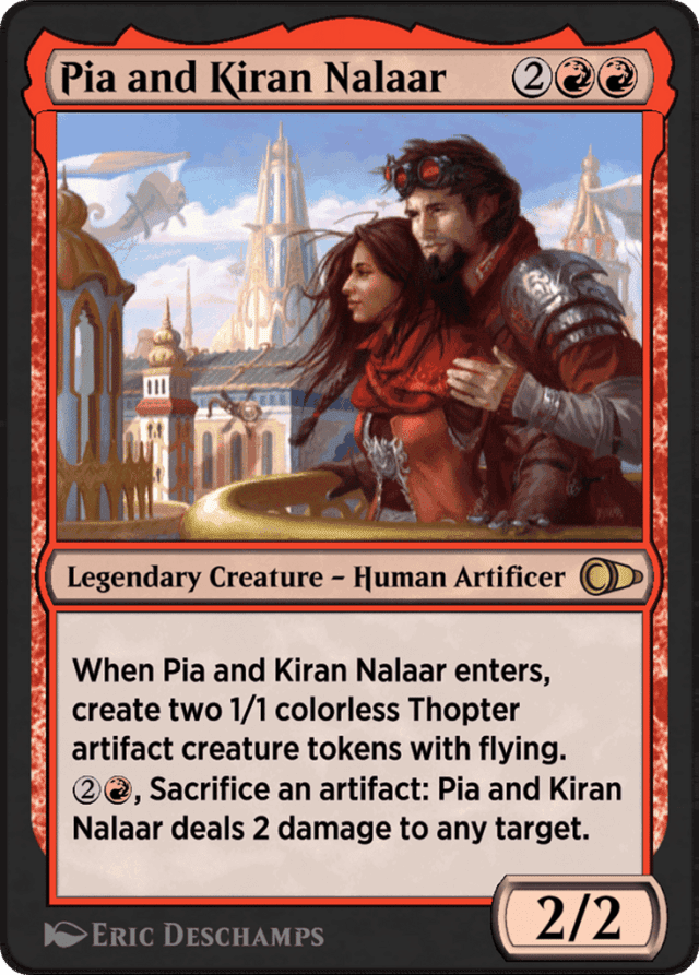 When Pia and Kiran Nalaar enters, create two 1/1 colorless Thopter artifact creature tokens with flying. {2}{R}, Sacrifice an artifact: Pia and Kiran Nalaar deals 2 damage to any target.