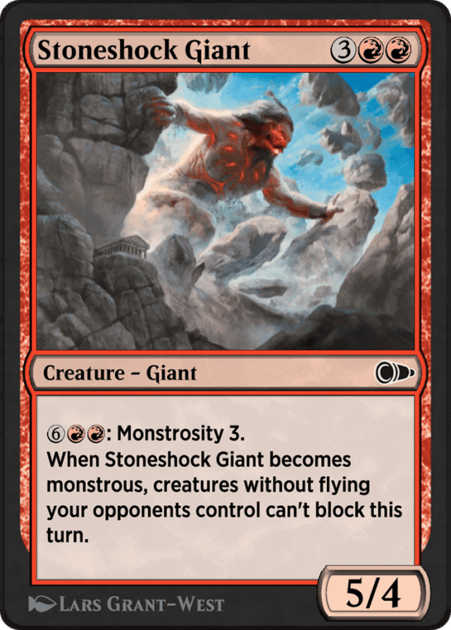 An ability that triggers when a creature becomes monstrous won't trigger if that creature isn't on the battlefield when its monstrosity ability resolves. — If blockers have already been declared when Stoneshock Giant's last ability resolves, those blocks won't change or become undone. — Monstrous isn't an ability that a creature has. It's just something true about that creature. If the creature stops being a creature or loses its abilities, it will continue to be monstrous. — Once a creature becomes monstrous, it can't become monstrous again. If the creature is already monstrous when the monstrosity ability resolves, nothing happens. — Your opponents can't assign any creature without flying to block that turn, even if that creature had flying or wasn't on the battlefield under one of your opponent's control when Stoneshock Giant's ability resolved.