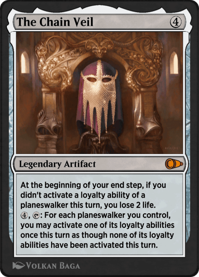 After the last ability resolves, you’ll essentially be able to activate a loyalty ability of each planeswalker you control a total of twice during your turn. The timing rules for when you can activate loyalty abilities apply each time; it must be your main phase and the stack must be empty. — Because the last ability modifies the rules of the game, it affects not only planeswalkers you control when it resolves, but also planeswalkers that come under your control later in the turn. — Each additional time The Chain Veil’s last ability resolves will allow you to activate a loyalty ability of each planeswalker you control an additional time. For example, if you activate The Chain Veil’s last ability, untap it, then activate it again, you can activate a loyalty ability of a planeswalker you control three times that turn. — For the first ability, it doesn’t matter whether the planeswalker is still on the battlefield as your end step begins. If you activated one of its loyalty abilities that turn, The Chain Veil’s triggered ability won’t trigger. — The second loyalty ability you activate doesn’t have to be the same as the first ability. For example, you could activate a planeswalker’s first ability twice, or you could activate a planeswalker’s first ability, then activate its second ability.
