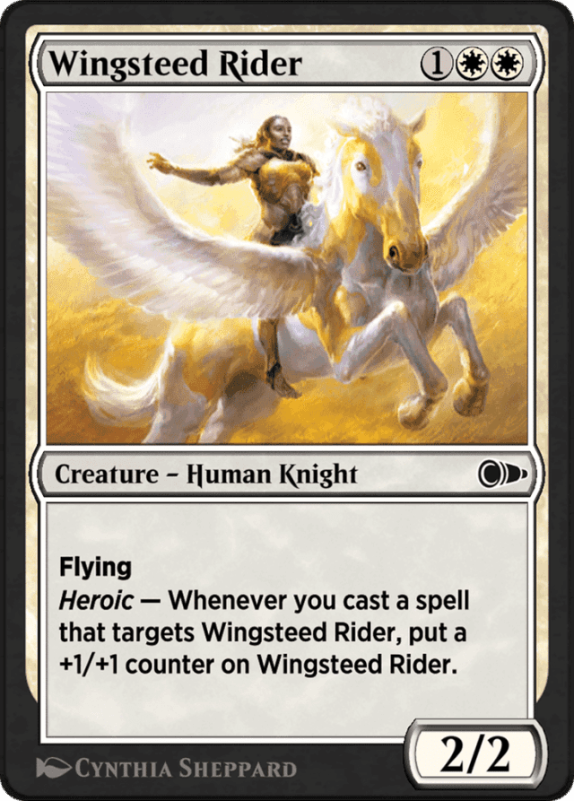 Flying Heroic — Whenever you cast a spell that targets this creature, put a +1/+1 counter on this creature.
