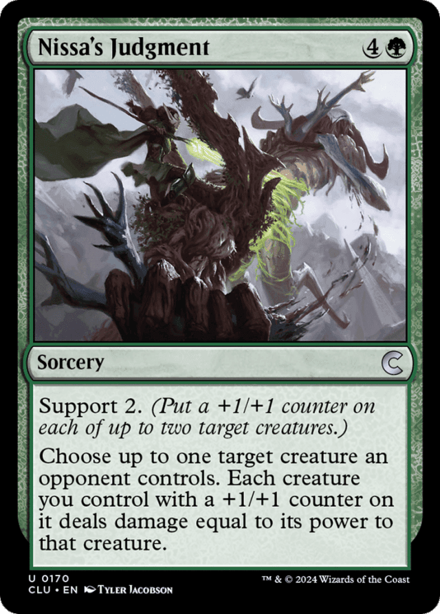 As Nissa’s Judgment resolves, if at least one of its targets is still legal, it will resolve, affecting only targets that are still legal at that time. If none of its targets are still legal at that time, it won’t resolve and none of its effects will happen. — If a spell with support has other abilities that target creatures, those abilities and the support ability can target the same creature. — Support can target a creature you don’t control. — You can’t put more than one +1/+1 counter on any one target using the support action. — You finish the support action before any creatures deal damage. Creatures that get a +1/+1 counter will deal damage to the creature an opponent controls, if applicable.