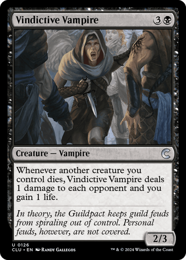 If Vindictive Vampire dies at the same time as one or more other creatures you control, Vindictive Vampire’s ability triggers for each of those other creatures. — If your life total is brought to 0 or less at the same time that creatures you control are dealt lethal damage, you lose the game before Vindictive Vampire’s triggered ability goes on the stack. — In a Two-Headed Giant game, Vindictive Vampire’s ability causes the opposing team to lose 2 life and you gain 1 life.