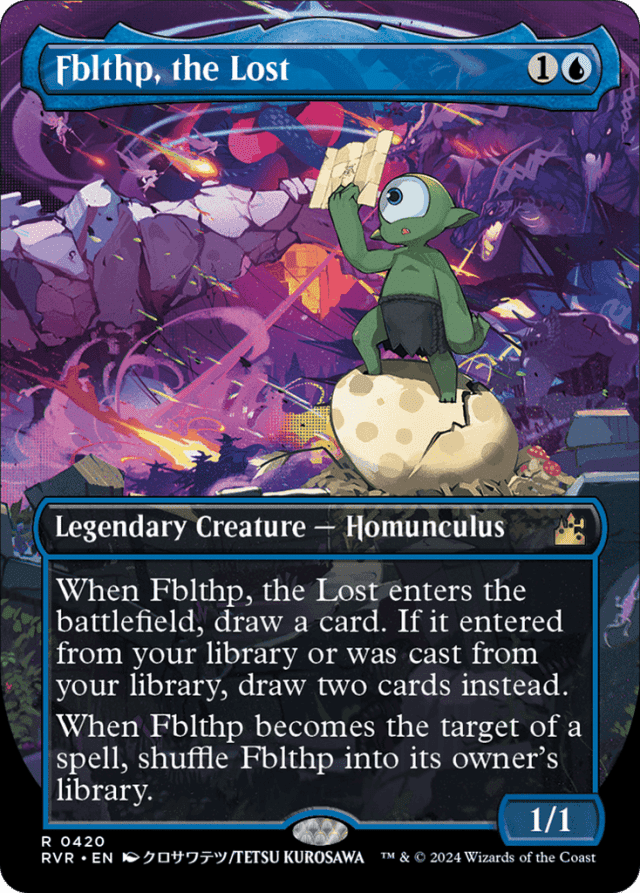 When Fblthp enters, draw a card. If it entered from your library or was cast from your library, draw two cards instead. When Fblthp becomes the target of a spell, shuffle Fblthp into its owner's library.