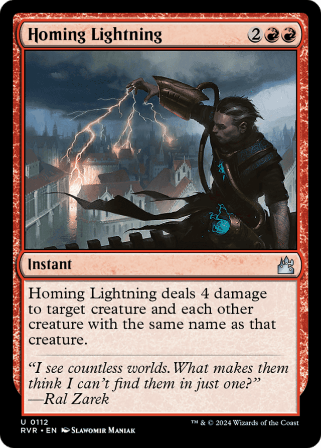 Homing Lightning deals 4 damage to target creature and each other creature with the same name as that creature.