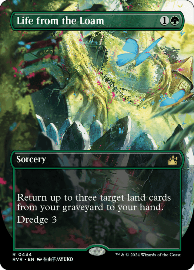 Return up to three target land cards from your graveyard to your hand. Dredge 3 (If you would draw a card, you may mill three cards instead. If you do, return this card from your graveyard to your hand.)