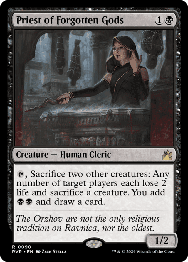 Because it may have targets, the ability of Priest of Forgotten Gods isn't a mana ability. It uses the stack and can be responded to, even if no targets were chosen. — You can activate the ability of Priest of Forgotten Gods without choosing any targets if you wish. You'll still add {B}{B} and draw a card. — You may target players who can't sacrifice a creature. Those players still lose 2 life.