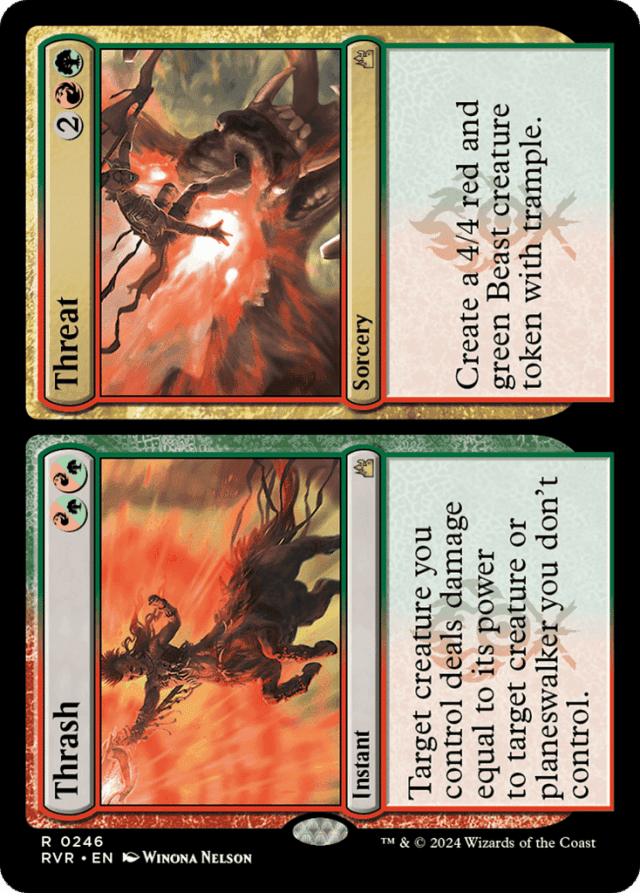 If either target is an illegal target as Thrash tries to resolve, the creature you control won't deal damage. — A split card's characteristics are a combination of its two halves while it is not on the stack. For example, Assault // Battery has a mana value of 5 while it is in your library. If an effect allows you to search your library for a card with mana value 4 or less, you can't find Assault // Battery. — Each split card has two names. If an effect instructs you to choose a card name, you may choose one of those names, but not both. — Each split card is a single card. For example, if you discard a split card, you've discarded one card, not two. If an effect counts the number of sorcery cards in your graveyard, Assault // Battery counts once, not twice. — If an effect allows you to cast a spell with certain characteristics, consider only the characteristics of the half you're casting. For example, if an effect allows you to cast a sorcery spell with mana value 2 or less from among cards in your graveyard, you could cast Assault this way, but not Battery. — If you copy a spell that's half of a split card, the copy copies that same half. For example, if you copy Assault, the copy is also Assault, not Battery. — Split cards have two card faces on a single card. The characteristics of the half you didn't cast are ignored while the spell is on the stack. — To cast a split card, choose one of its halves to cast. There's no way to cast both halves of this split card.
