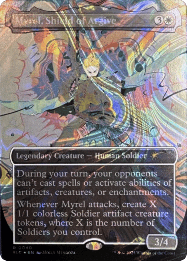 During your turn, your opponents can't cast spells or activate abilities of artifacts, creatures, or enchantments. Whenever Myrel attacks, create X 1/1 colorless Soldier artifact creature tokens, where X is the number of Soldiers you control.