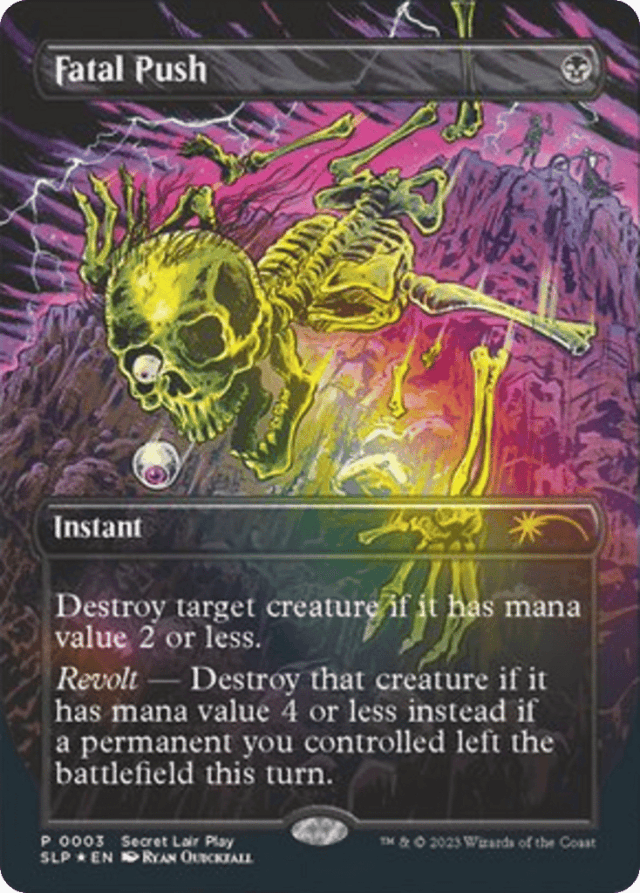 Fatal Push can target any creature, even one with mana value 5 or greater. The creature's mana value is checked only as Fatal Push resolves. — If a creature on the battlefield has {X} in its mana cost, X is considered to be 0. — Revolt abilities don't care why the permanent left the battlefield, who caused it to move, or where it moved to. They're equally satisfied by an artifact you sacrificed to pay a cost, a creature you controlled that was destroyed by Cast Down, or an enchantment you returned to your hand with Cyclonic Rift. — Tokens that leave the battlefield will satisfy a revolt ability.