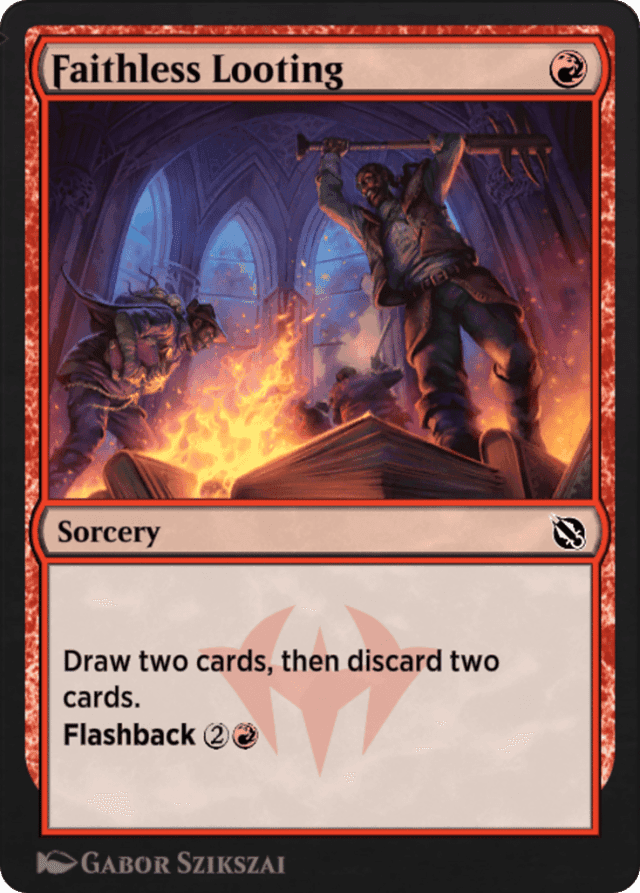 You draw two cards and discard two cards all while Faithless Looting is resolving. Nothing can happen between the two, and no player may choose to take actions. — "Flashback [cost]" means "You may cast this card from your graveyard by paying [cost] rather than paying its mana cost" and "If the flashback cost was paid, exile this card instead of putting it anywhere else any time it would leave the stack." — A spell cast using flashback will always be exiled afterward, whether it resolves, is countered, or leaves the stack in some other way. — If a card with flashback is put into your graveyard during your turn, you can cast it if it's legal to do so before any other player can take any actions. — To determine the total cost of a spell, start with the mana cost or alternative cost (such as a flashback cost) you're paying, add any cost increases, then apply any cost reductions. The mana value of the spell is determined only by its mana cost, no matter what the total cost to cast the spell was. — You can cast a spell using flashback even if it was somehow put into your graveyard without having been cast. — You must still follow any timing restrictions and permissions, including those based on the card's type. For instance, you can cast a sorcery using flashback only when you could normally cast a sorcery.