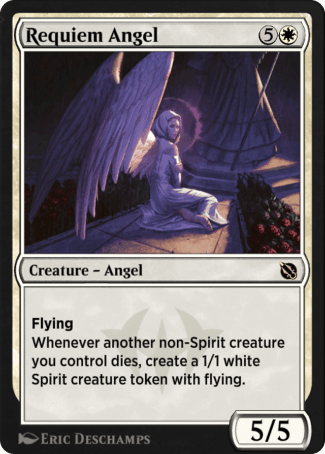 Flying Whenever another non-Spirit creature you control dies, create a 1/1 white Spirit creature token with flying.