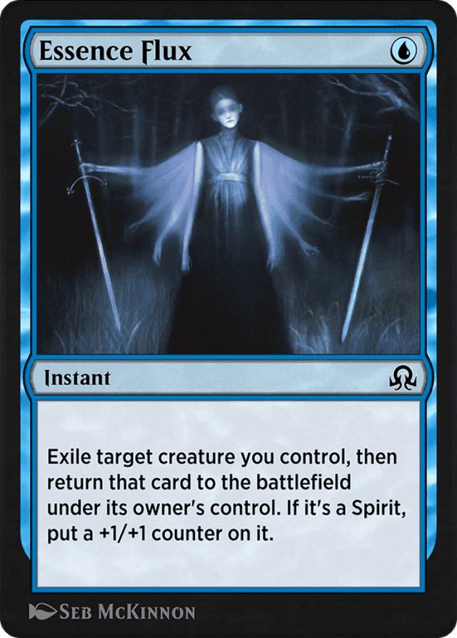 Auras attached to the exiled creature will be put into their owners’ graveyards. Equipment attached to the exiled creature will become unattached and remain on the battlefield. Any counters on the exiled creature will cease to exist. — Essence Flux checks whether the creature is a Spirit after it has returned from exile. — If a creature token is exiled, it ceases to exist. It won’t be returned to the battlefield. — If a double-faced card is exiled, it will return with its front face up.