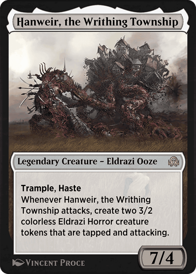 Trample, haste Whenever Hanweir attacks, create two 3/2 colorless Eldrazi Horror creature tokens that are tapped and attacking.