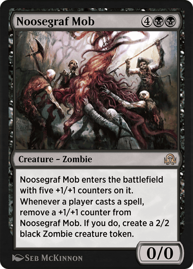 If Noosegraf Mob is no longer on the battlefield or no longer has +1/+1 counters on it as its triggered ability resolves, you can’t remove a counter from it and won’t get a Zombie token. — Noosegraf Mob’s triggered ability resolves before the spell that caused it to trigger. — You can’t remove more than one +1/+1 counter from Noosegraf Mob at once to get more Zombie tokens, and you can’t choose not to remove a counter.