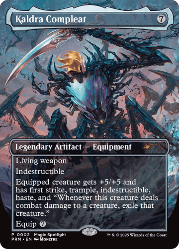 Living weapon Indestructible Equipped creature gets +5/+5 and has first strike, trample, indestructible, haste, and "Whenever this creature deals combat damage to a creature, exile that creature." Equip {7}