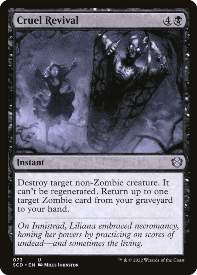 Destroy target non-Zombie creature. It can't be regenerated. Return up to one target Zombie card from your graveyard to your hand.