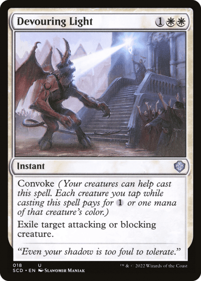 The declare blockers step is the last chance to cast Devouring Light before creatures deal their combat damage. However, a creature remains an attacking or blocking creature during the combat damage step and end of combat step. Devouring Light may be cast targeting such a creature during those steps, after the creature has dealt combat damage. — Because convoke isn't an alternative cost, it can be used in conjunction with alternative costs. — If a creature you control has a mana ability with {T} in the cost, activating that ability while casting a spell with convoke will result in the creature being tapped before you pay the spell's costs. You won't be able to tap it again for convoke. Similarly, if you sacrifice a creature to activate a mana ability while casting a spell with convoke, that creature won't be on the battlefield when you pay the spell's costs, so you won't be able to tap it for convoke. — Tapping a multicolored creature using convoke will pay for {1} or one mana of your choice of any of that creature's colors. — Tapping an untapped creature that's attacking or blocking to convoke a spell won't cause that creature to stop attacking or blocking. — When calculating a spell's total cost, include any alternative costs, additional costs, or anything else that increases or reduces the cost to cast the spell. Convoke applies after the total cost is calculated. Convoke doesn't change a spell's mana cost or mana value. — You can tap any untapped creature you control to convoke a spell, even one you haven't controlled continuously since the beginning of your most recent turn.