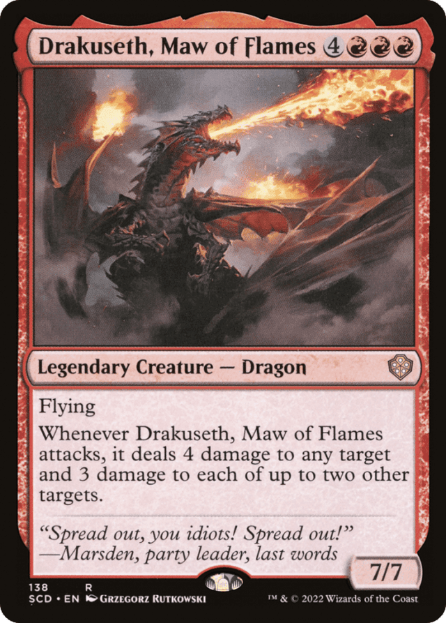 Flying Whenever Drakuseth attacks, it deals 4 damage to any target and 3 damage to each of up to two other targets.
