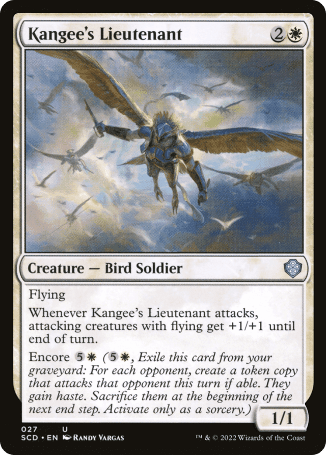 Each token must attack the appropriate player if able. — Exiling the card with encore is a cost to activate the ability. Once you announce that you're activating it, no player may take actions until you've finished. They can't try to remove the card from your graveyard to stop you from paying the cost. — If one of the tokens can't attack for any reason (such as being tapped), then it doesn't attack. If there's a cost associated with having it attack, you aren't forced to pay that cost, so it doesn't have to attack in that case either. — If one of the tokens somehow is under another player's control as the delayed triggered ability resolves, you can't sacrifice that token. It remains on the battlefield indefinitely, even if you regain control of it later. — Only attacking creatures that have flying as Kangee's Lieutenant's second ability resolves will get +1/+1. Giving a creature flying or making it lose flying after that point won't change that bonus, if any. — Opponents who have left the game aren't counted when determining how many tokens to create. — The tokens copy only what's on the original card. Effects that modified that creature when it was previously on the battlefield won't be copied. — If an effect stops a token from attacking a specific player, that token can attack any player, planeswalker, or battle, or not attack at all. If the effect stops the token from attacking a specific player unless a cost is paid, you don't have to pay that cost unless you want to attack that player.