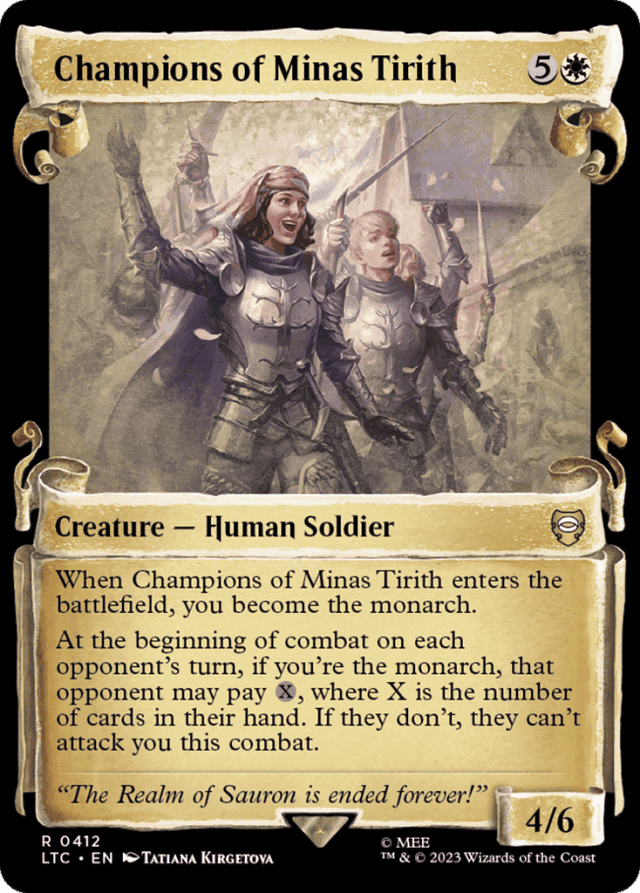 An opponent who chooses not to pay {X} for Champions of Minas Tirith's last ability can still attack planeswalkers you control or battles you're protecting. — If combat damage dealt to the monarch causes that player to lose the game, the triggered ability that causes the controller of the attacking creature to become the monarch doesn't resolve. In most cases, the controller of the attacking creature will still become the monarch as it is likely their turn. — If the monarch leaves the game during another player's turn, that player becomes the monarch. If the monarch leaves the game during their turn, the next player in turn order becomes the monarch. — If the triggered ability that causes the monarch to draw a card goes on the stack and a different player becomes the monarch before that ability resolves, the first player will still draw the card. — The game starts with no monarch. Once an effect makes one player the monarch, the game will have exactly one monarch from that point forward. As a player becomes the monarch, the current monarch (if any) ceases being the monarch. — There are two inherent triggered abilities associated with being the monarch. These triggered abilities have no source and are controlled by the player who was the monarch at the time the abilities triggered. The full texts of these abilities are "At the beginning of the monarch's end step, that player draws a card" and "Whenever a creature deals combat damage to the monarch, its controller becomes the monarch."