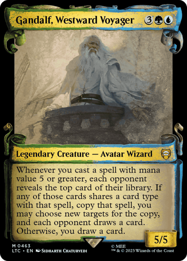 Whenever you cast a spell with mana value 5 or greater, each opponent reveals the top card of their library. If any of those cards shares a card type with that spell, copy that spell, you may choose new targets for the copy, and each opponent draws a card. Otherwise, you draw a card. (A copy of a permanent spell becomes a token.)
