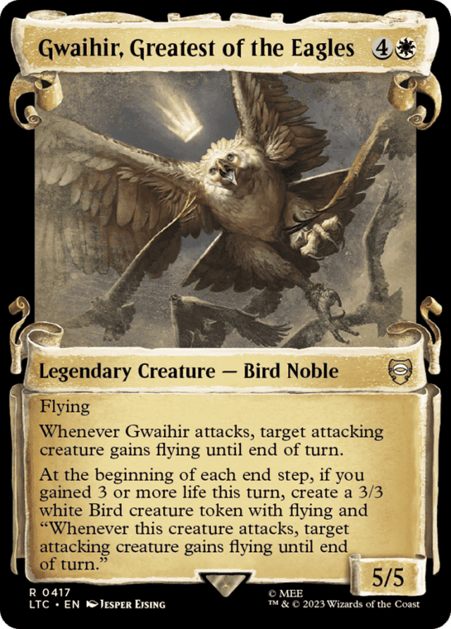 Flying Whenever Gwaihir attacks, target attacking creature gains flying until end of turn. At the beginning of each end step, if you gained 3 or more life this turn, create a 3/3 white Bird creature token with flying and "Whenever this token attacks, target attacking creature gains flying until end of turn."