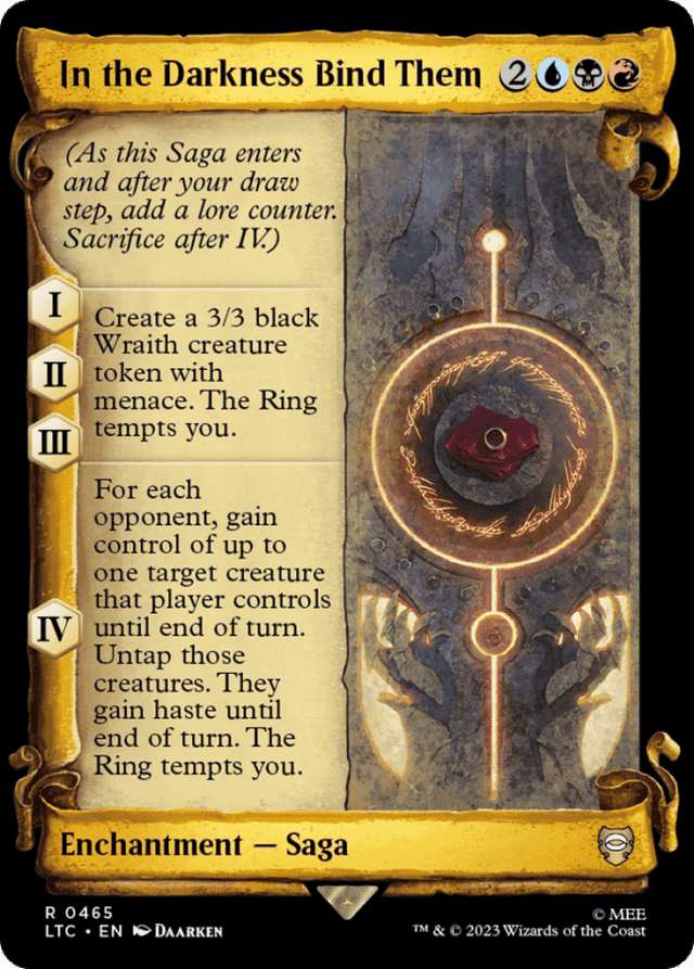 (As this Saga enters and after your draw step, add a lore counter. Sacrifice after IV.) I, II, III — Create a 3/3 black Wraith creature token with menace. The Ring tempts you. IV — For each opponent, gain control of up to one target creature that player controls until end of turn. Untap those creatures. They gain haste until end of turn. The Ring tempts you.