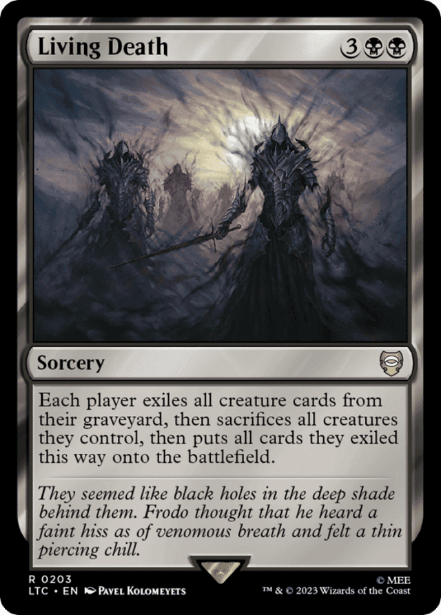As Living Death resolves, all players exile their creature cards from graveyards at the same time. Then all players sacrifice all creatures they control at the same time. Then all players put all creatures they exiled onto the battlefield at the same time. — Only cards exiled by Living Death's first instruction are put onto the battlefield. If a replacement effect (such as that of Leyline of the Void) causes any of the sacrificed creatures to be exiled instead of put into a graveyard, those cards aren't returned to the battlefield.