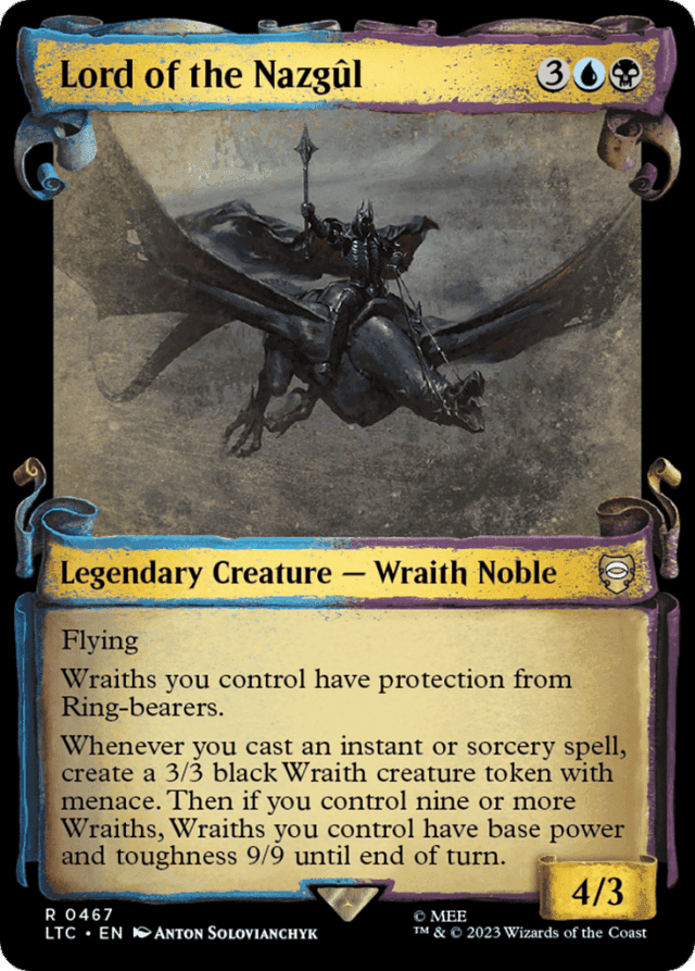 Flying Wraiths you control have protection from Ring-bearers. Whenever you cast an instant or sorcery spell, create a 3/3 black Wraith creature token with menace. Then if you control nine or more Wraiths, Wraiths you control have base power and toughness 9/9 until end of turn.