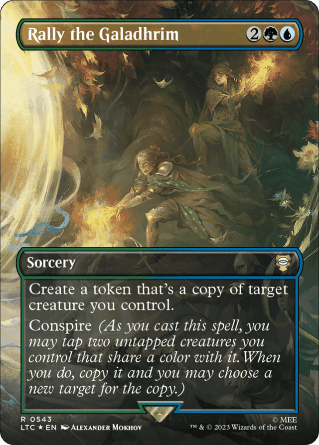 A copy of a spell can be countered like any other spell, but it must be countered individually. Countering a spell with conspire won't affect the copy, and vice versa. — Any enters-the-battlefield abilities of the copied creature will trigger when the token enters the battlefield. Any "as [this creature] enters the battlefield" or "[this creature] enters the battlefield with" abilities of the copied creature will also work. — Conspire represents both an additional cost and a triggered ability that triggers when you cast the spell if you paid that cost. — Each creature you tap for conspire must share a color with Rally the Galadhrim For example, you could tap two green creatures, two blue creatures, or one of each. For either or both of the creatures, you may tap a multicolored creature that's green and/or blue, and possibly other colors as well. — If a spell with conspire has targets, you may choose new targets for the copy. — If the copied creature has {X} in its mana cost, X is 0. — If the copied creature is a token, the token that's created copies the original characteristics of that token as stated by the effect that created that token. — If the copied creature is copying something else, then the token enters the battlefield as whatever that creature copied. — The copy that conspire creates is created on the stack, so it's not "cast." Abilities that trigger when a player casts a spell won't trigger. — The token copies exactly what was printed on the original creature and nothing else (unless that creature is copying something else or is a token; see below). It doesn't copy whether that creature is tapped or untapped, whether it has any counters on it or Auras and Equipment attached to it, or any non-copy effects that have changed its power, toughness, types, color, and so on. — The triggered ability that creates the copy can itself be countered by anything that can counter a triggered ability. If it is countered, no copies will be put onto the stack.