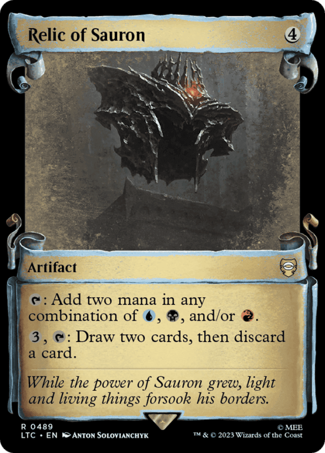 {T}: Add two mana in any combination of {U}, {B}, and/or {R}. {3}, {T}: Draw two cards, then discard a card.