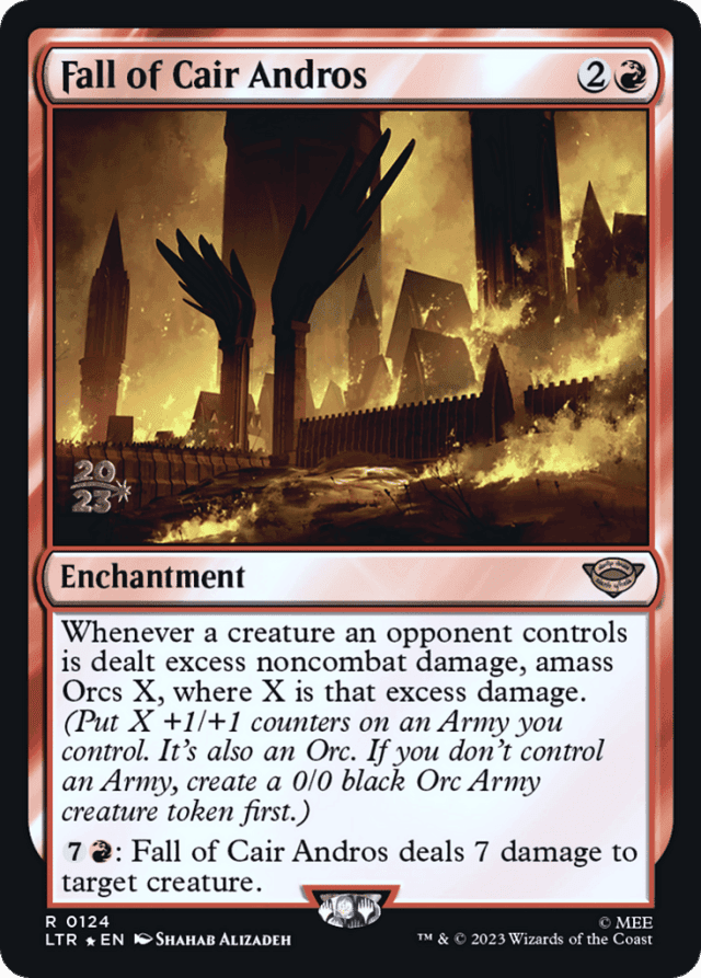 Whenever a creature an opponent controls is dealt excess noncombat damage, amass Orcs X, where X is that excess damage. (Put X +1/+1 counters on an Army you control. It's also an Orc. If you don't control an Army, create a 0/0 black Orc Army creature token first.) {7}{R}: This enchantment deals 7 damage to target creature.