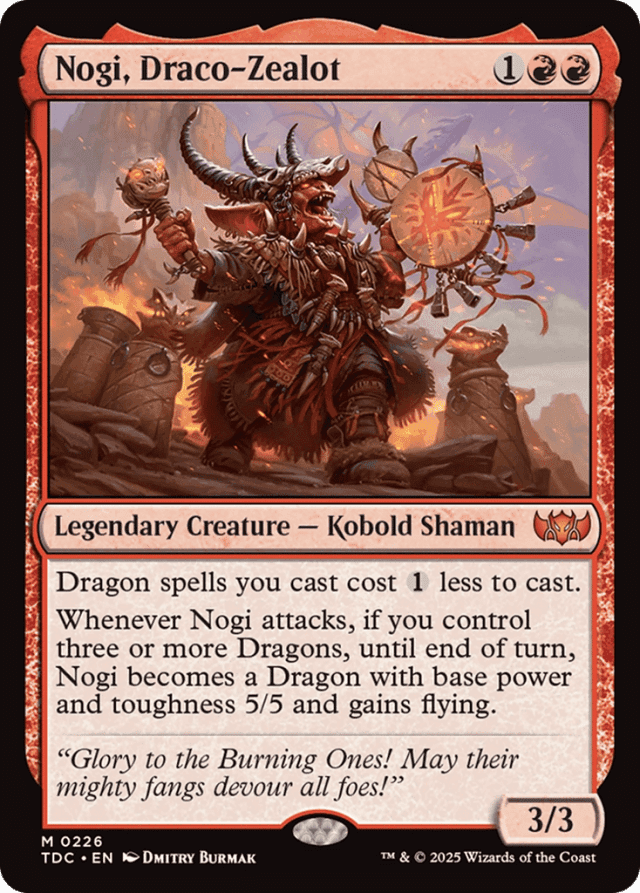 Dragon spells you cast cost {1} less to cast. Whenever Nogi attacks, if you control three or more Dragons, until end of turn, Nogi becomes a Dragon with base power and toughness 5/5 and gains flying.
