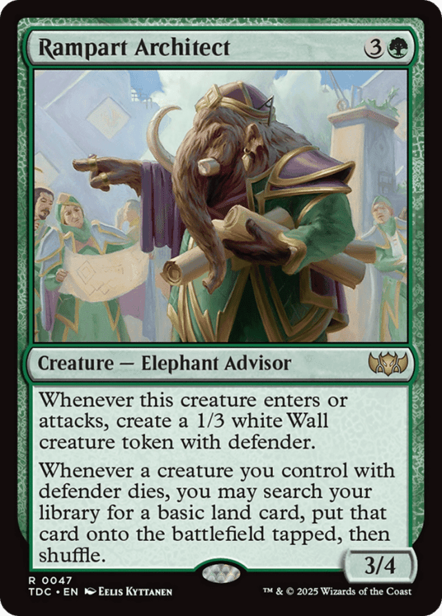 Whenever this creature enters or attacks, create a 1/3 white Wall creature token with defender. Whenever a creature you control with defender dies, you may search your library for a basic land card, put that card onto the battlefield tapped, then shuffle.