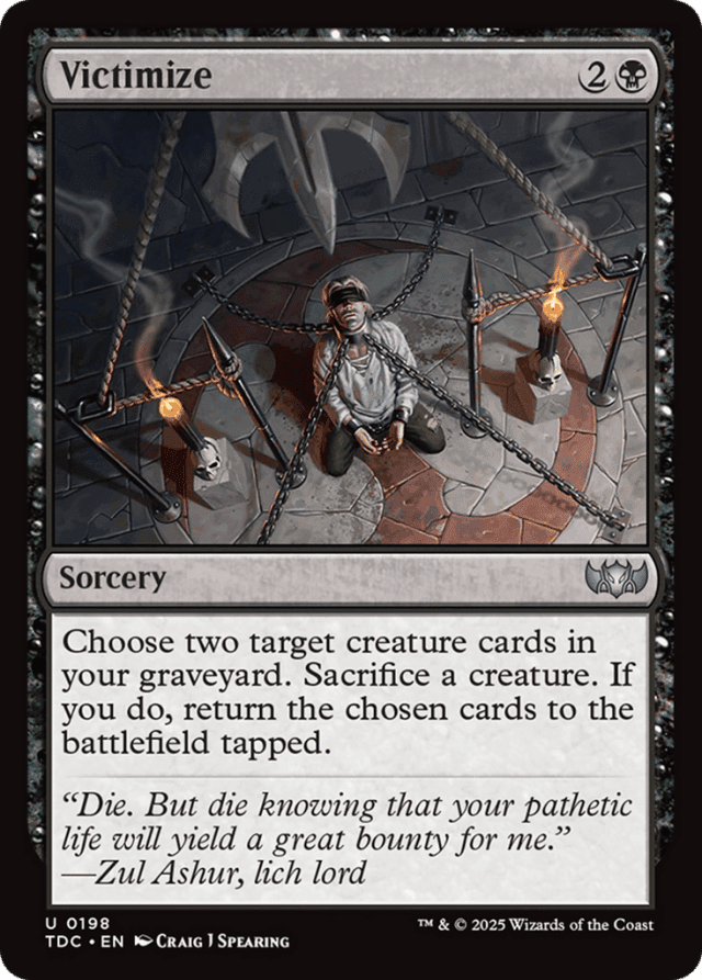 As Victimize resolves, you must sacrifice a creature if able. You can't change your mind and choose not to sacrifice anything. — If one of the targeted creature cards is an illegal target (for instance, because it has left your graveyard before Victimize resolves), you'll still sacrifice a creature and put the other card onto the battlefield. If both are illegal targets, Victimize won't resolve. You won't sacrifice a creature. — The creature you sacrifice isn't chosen until Victimize resolves. You can't return the creature you sacrifice because it will still be on the battlefield at the time targets are chosen. — You must choose two targets. You can't cast Victimize targeting only one creature card.